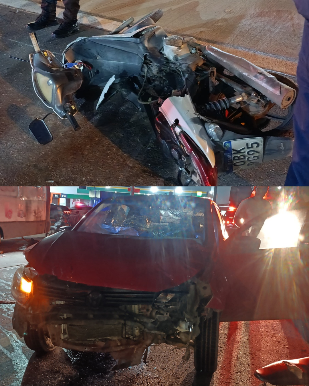 Três pessoas ficaram feridas após um acidente de trânsito envolvendo uma motoneta e um carro, na avenida Historiador Rubens de Mendonça, próximo do estádio Verdinho, no CPA, na noite deste domingo (29.03), em Cuiabá.